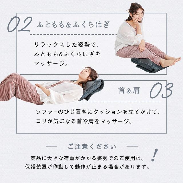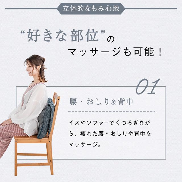 クッションを移動するだけで、肩だけではなく、首や腰・背中などをマッサージすることもできます。さらに、床に座れば、ふくらはぎや太ももなどにも使えるという優れもの。自分の好みの場所をマッサージできるのがいいんですよね〜。
